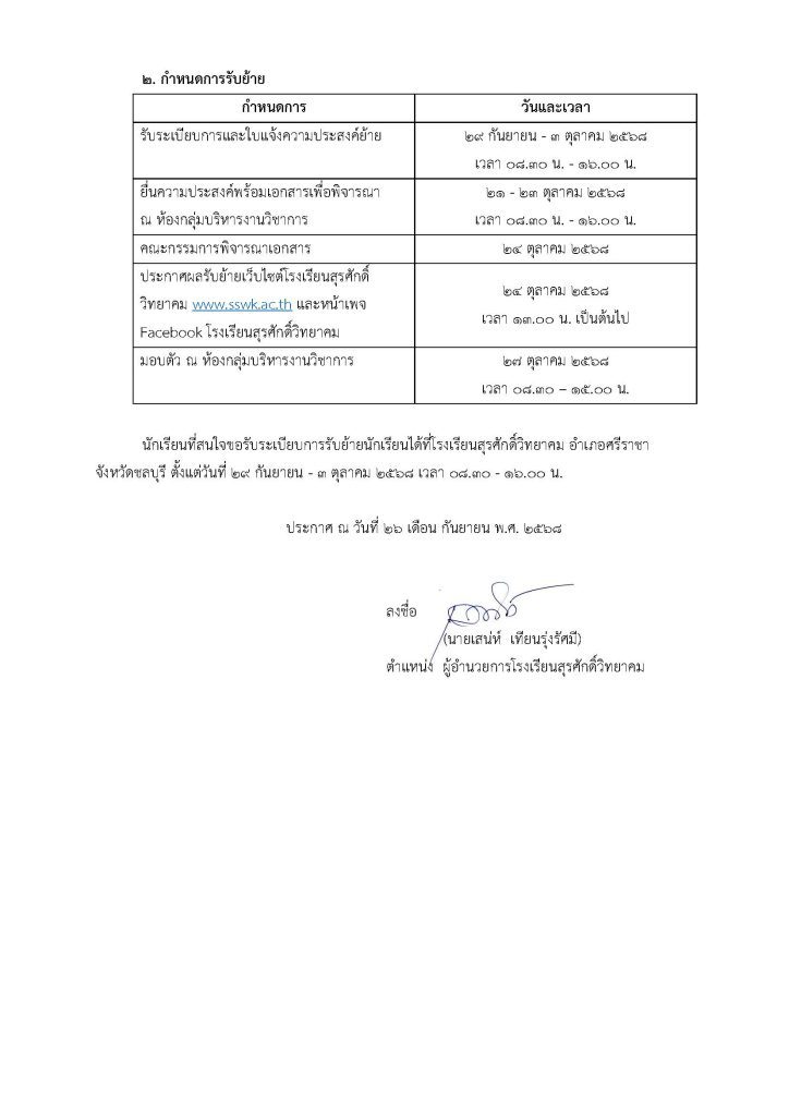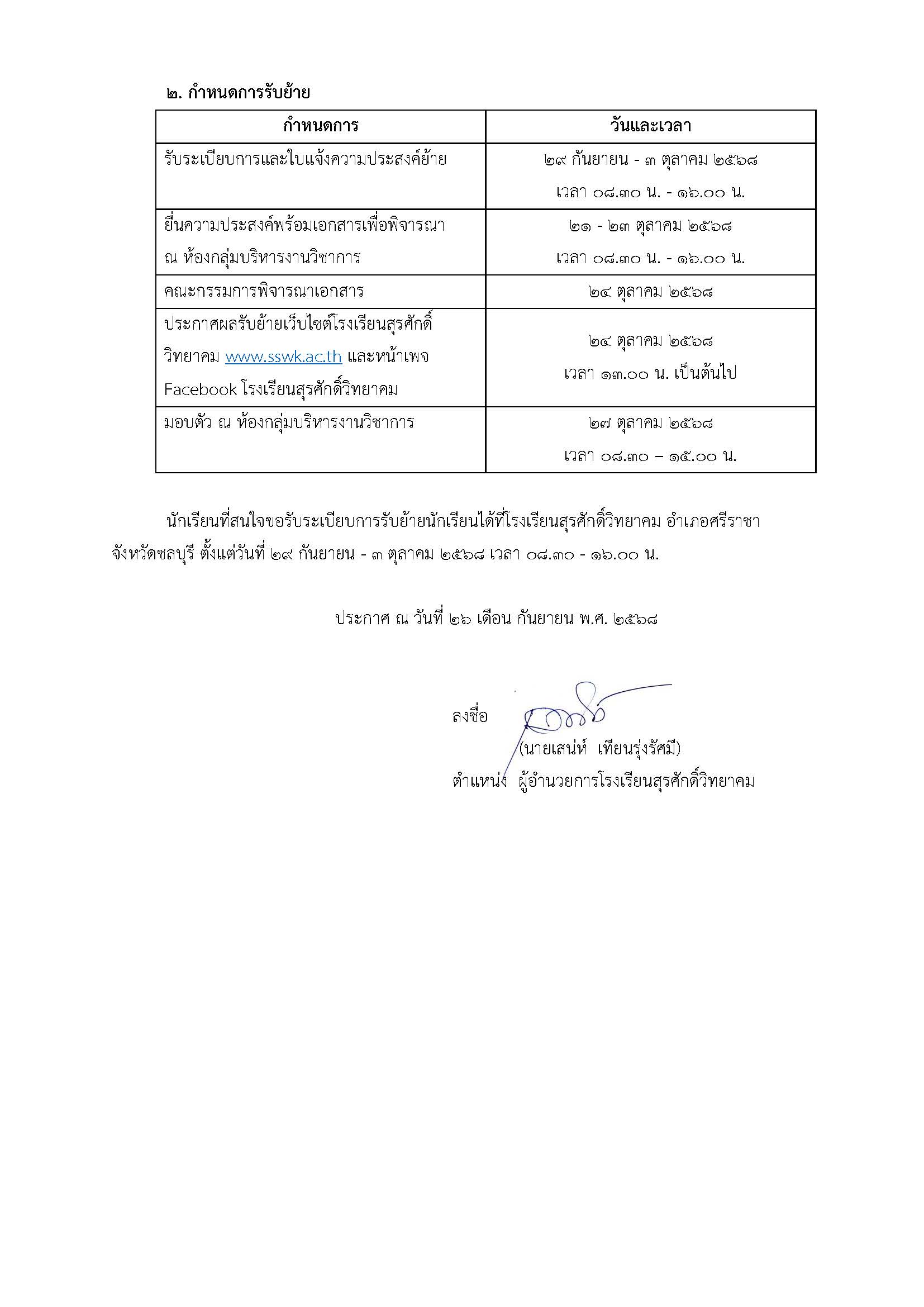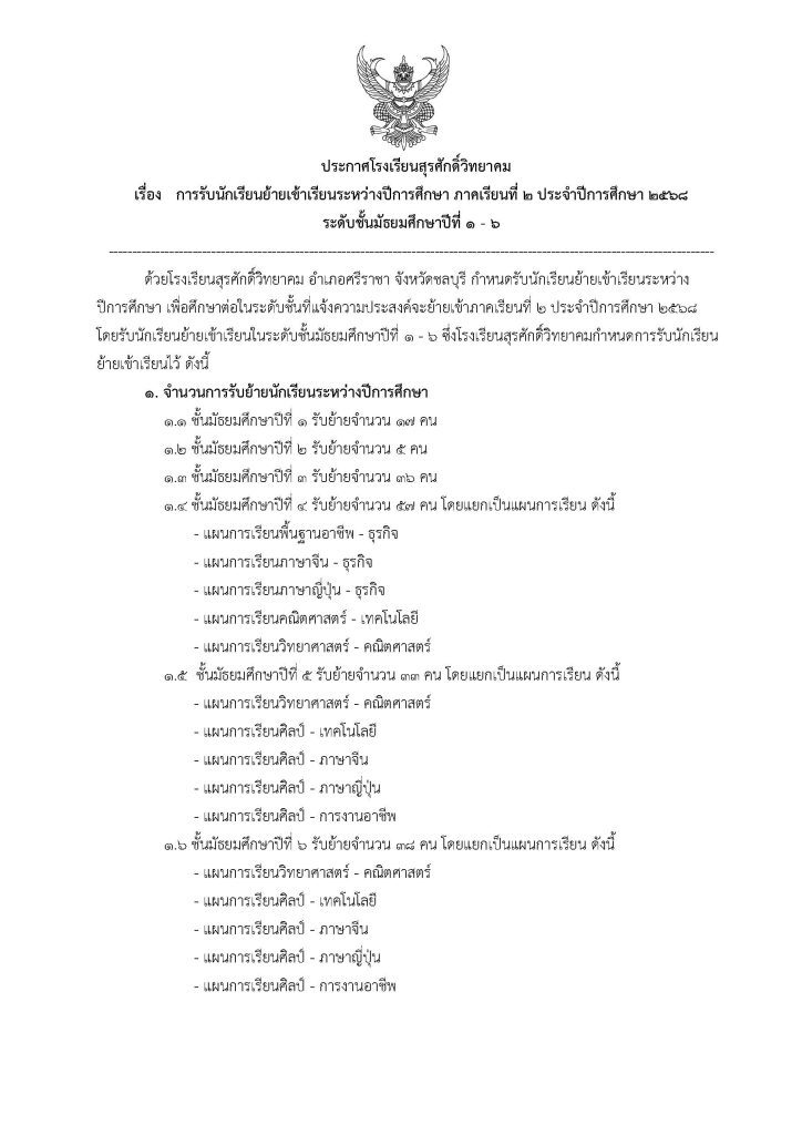 ประกาศโรงเรียนสุรศักดิ์วิทยาคม เรื่อง การรับนักเรียนย้ายเข้าเรียนระหว่างปีการศึกษา ภาคเรียนที่ 2 ประจำปีการศึกษา 2568 ระดับชั้นมัธยาศึกษาปีที่ 1-6 Post author:Admin Post published:September 29, 2025 You Might Also Like ประกาศโรงเรียนสุรศักดิ์วิทยาคม เรื่อง การตรวจสอบผลการเรียนสำหรับนักเรียนและผู้ปกครอง August 17, 2025 ประกาศโรงเรียนสุรศักดิ์วิทยาคม เรื่อง มาตรการและแนวปฏิบัติป้องกันฝุ่นละอองขนาดเล็ก (PM 2.5) September 18, 2024 ประกาศโรงเรียนสุรศักดิ์วิทยาคม เรื่อง ประกาศรายชื่อผู้ผ่านการสอบคัดเลือกเพื่อเป็นลูกจ้างชั่วคราว ตำแหน่ง เจ้าหน้าที่งานพัสดุและสินทรัพย์ ประจำปีงบประมาณ 2568 April 3, 2025